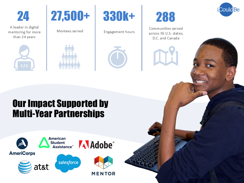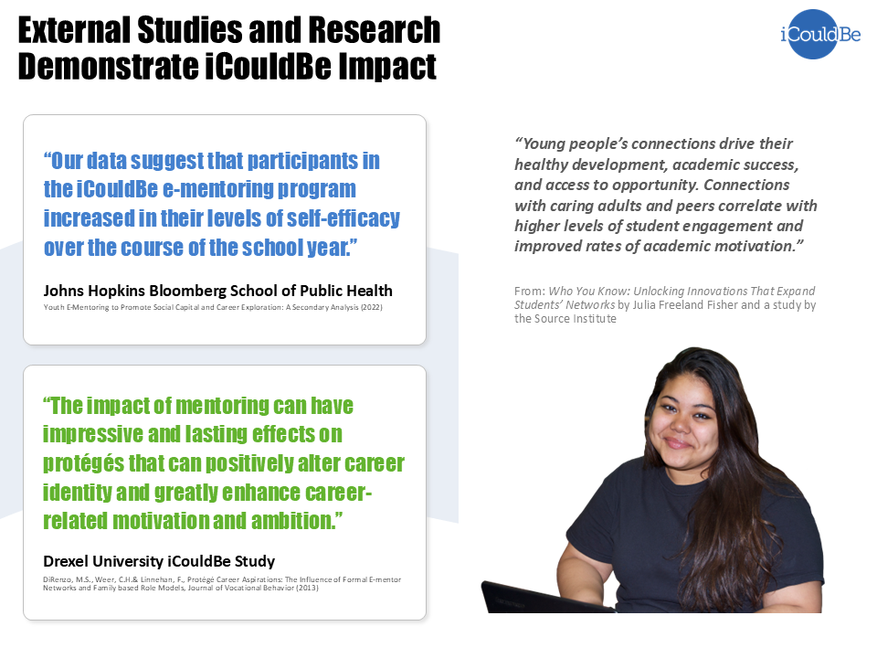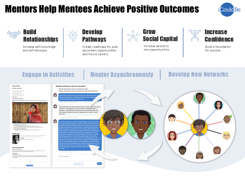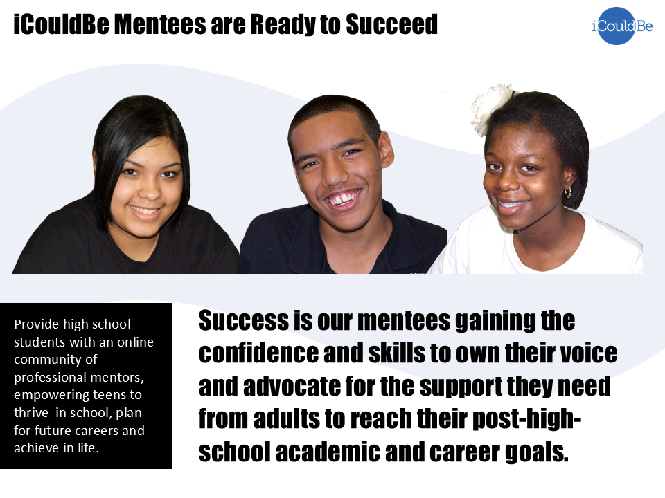 The mission of iCouldBe is to provide high school students with an online community of professional mentors, empowering teens to thrive in school, plan for future careers, and achieve in life.