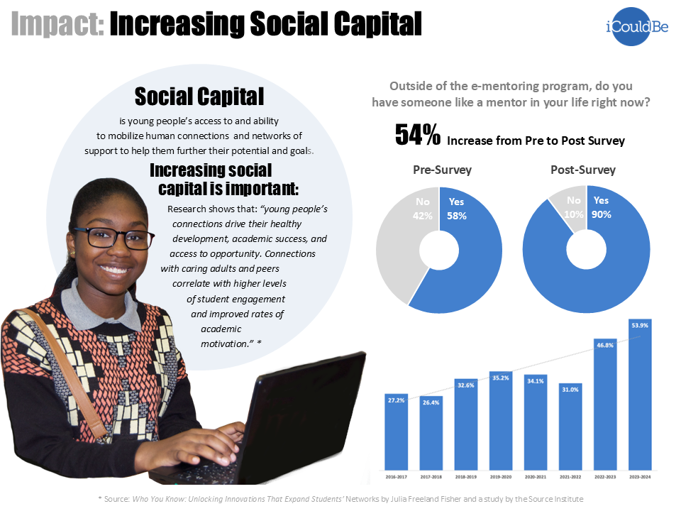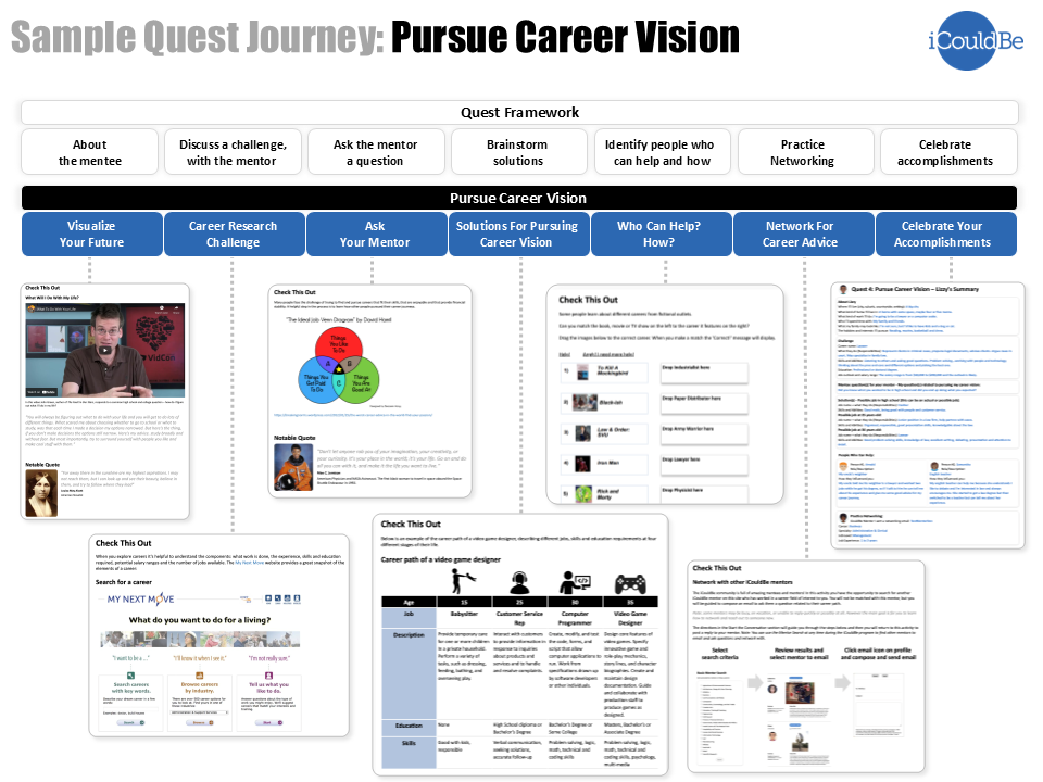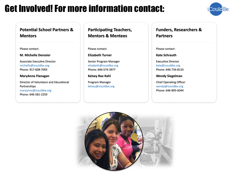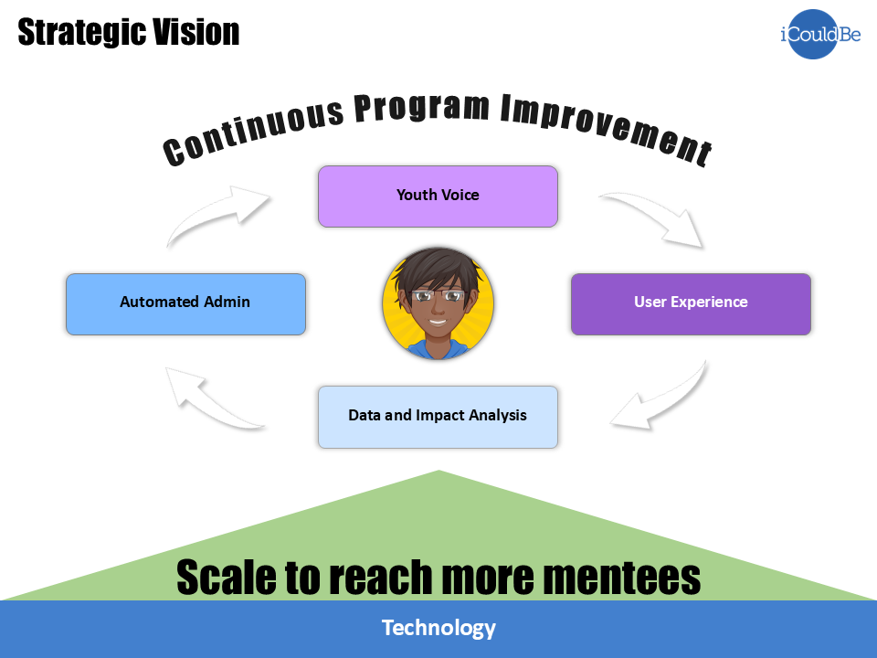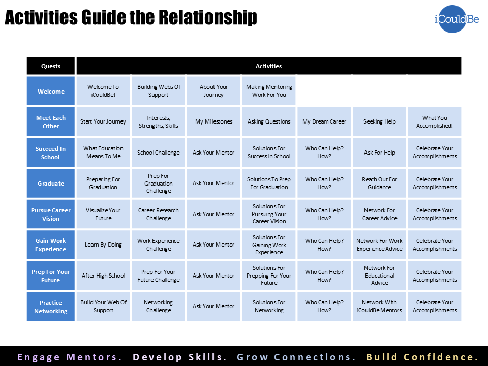 The mission of iCouldBe is to provide high school students with an online community of professional mentors, empowering teens to thrive in school, plan for future careers, and achieve in life.